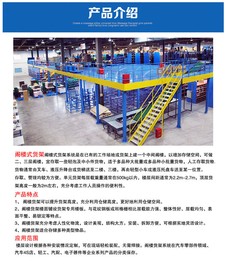 閣樓式貨架系統(tǒng)是在已有的工作場地或貨架上建一個中間閣樓,以增加存儲空間,可做二、三層閣樓,宜存取一些輕泡及中小件貨物,適于多品種大批量或多品種小批量貨物,人工存取貨物.貨物通常由叉車、液壓升降臺或貨梯送至二樓、三樓,再由輕型小車或液壓托盤車送至某一位置。 近幾年多使用冷軋型鋼樓板,它具有承載能力強(qiáng)、整體性好、承載均勻性好、精度高、表面平整、易鎖定等優(yōu)勢.有多種類型可選,并且易匹配照明系統(tǒng),存取、管理均較為方便。單元貨架每層載重量通常在500kg以內(nèi),樓層間距通常為2.2m~2.7m,頂層貨架高度一般為2m左右,充分考慮工作人員操作的便利性。 樓層設(shè)計根據(jù)各種安裝情況定制,可在現(xiàn)場輕松裝配,無需焊接。閣樓貨架系統(tǒng)在汽車零部件領(lǐng)域、汽車4S店、輕工、電子等行業(yè)有較多應(yīng)用。
