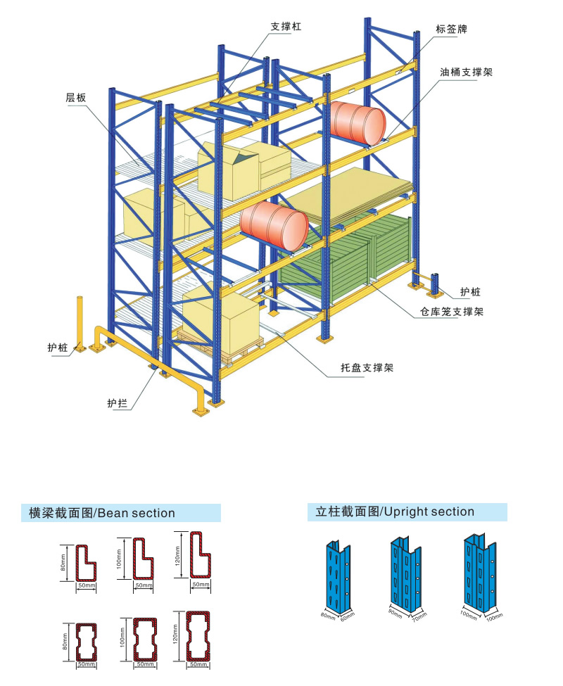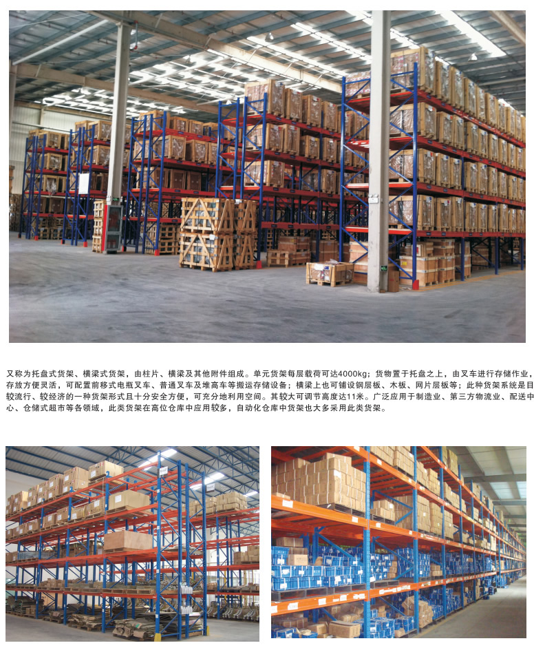 | 俗稱橫梁式貨架,或稱貨位式貨架,屬于托盤貨架類,在國內的各種倉儲貨架系統(tǒng)中為常見一種貨架形式。以立柱片+橫梁形式的全組裝結構,結構簡明有效。可根據存儲單元集裝設備的特性加裝如:隔檔、鋼層板(木層板)、金屬絲網層、倉儲籠導軌、油桶架等功能性附件。滿足不同單元集裝設備形式的貨物存儲。 重型貨架主要特征 ■通常貨物通過托盤、倉儲籠等單元集裝設備整裝后存入貨架保管。每單元載重一般在2000kg以內,每層通常放兩個單元。 ■是普遍和廣泛使用的貨架之一,適合絕大多數倉庫或產品貨物使用。 ■具有的貨物任意揀選特性。搬運機械如叉車等可到達任意貨位進行存儲作業(yè),存儲作業(yè)方便、快捷! ■以機械搬運設備進行存儲作業(yè)。 ■單元貨架跨度一般在4m以內,深度在1.5m以內,低、高位倉庫貨架高度一般在12m以內,超高位倉庫貨架高度一般在30m以內(此類倉庫基本均為自動化倉庫,貨架總高由若干段12m以內立柱構成)。 ■能夠以75mm的整數倍自由調節(jié)每層層高。 重型(橫梁式)貨架一般采用冷軋異型鋼制作,立柱由80(90)x60(70)Ω型鋼表面沖菱形孔而成,橫梁由80x50-100x50-120x50-140x50-160x50抱焊梁連接掛件而成,一般用托盤代替層板方便叉車搬運。層載重1噸到5噸的設計,表面靜電噴塑,防水防銹防腐蝕能力更強,安全系數高,插接式組合,不需要用螺絲和焊接,組裝非常方便,充分利用空間面積,提供倉儲能力。 |